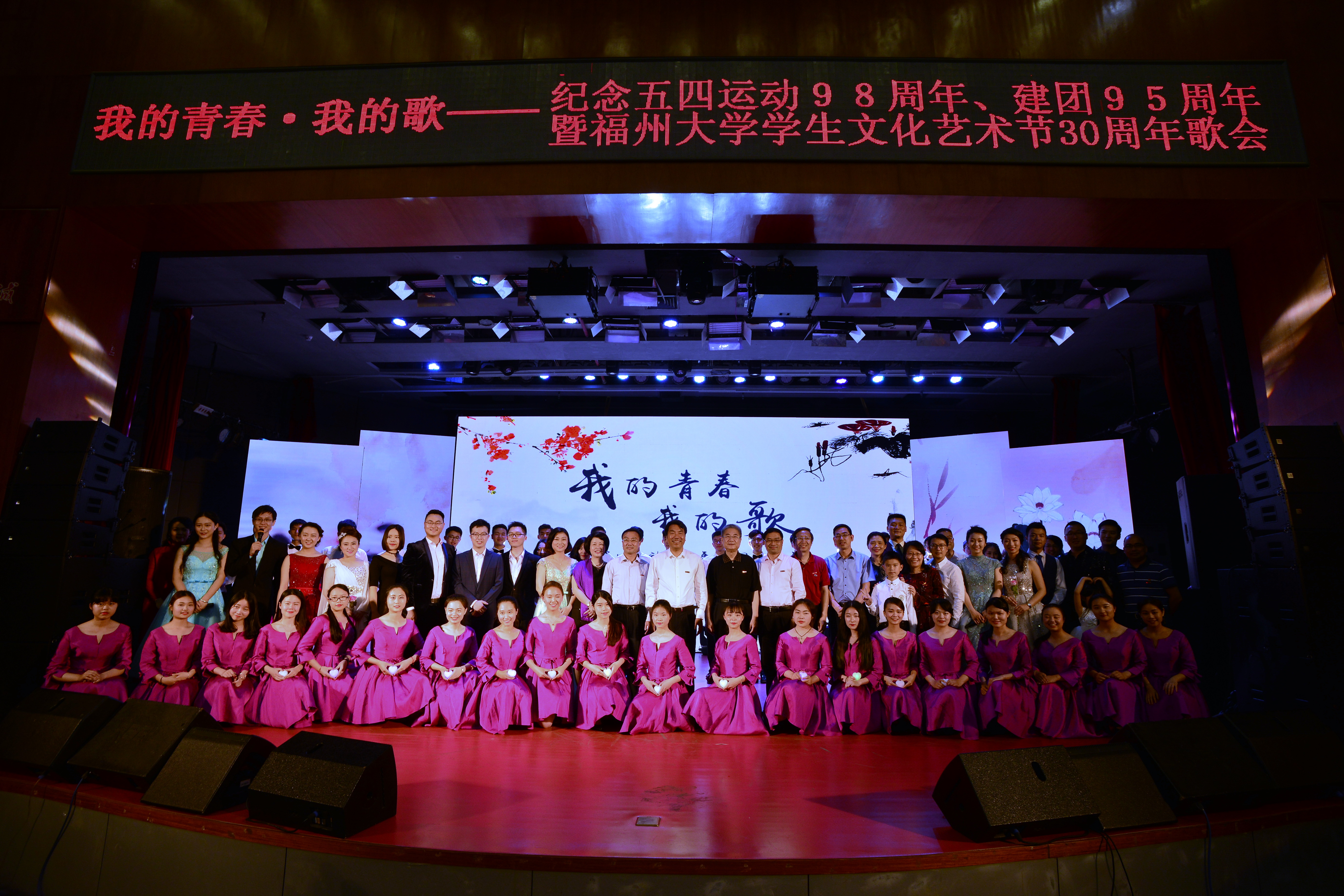 节目的最后便是今晚的表演者与校领导的合照,至此,本次的歌会便落下了圆满的帷幕。出席此次歌会的演唱者都是福大校友,在五四这个特殊的日子里,他们又相聚在了大学母校,他们风华正茂的地方,用自己的嗓音纪念那段美好的回忆。