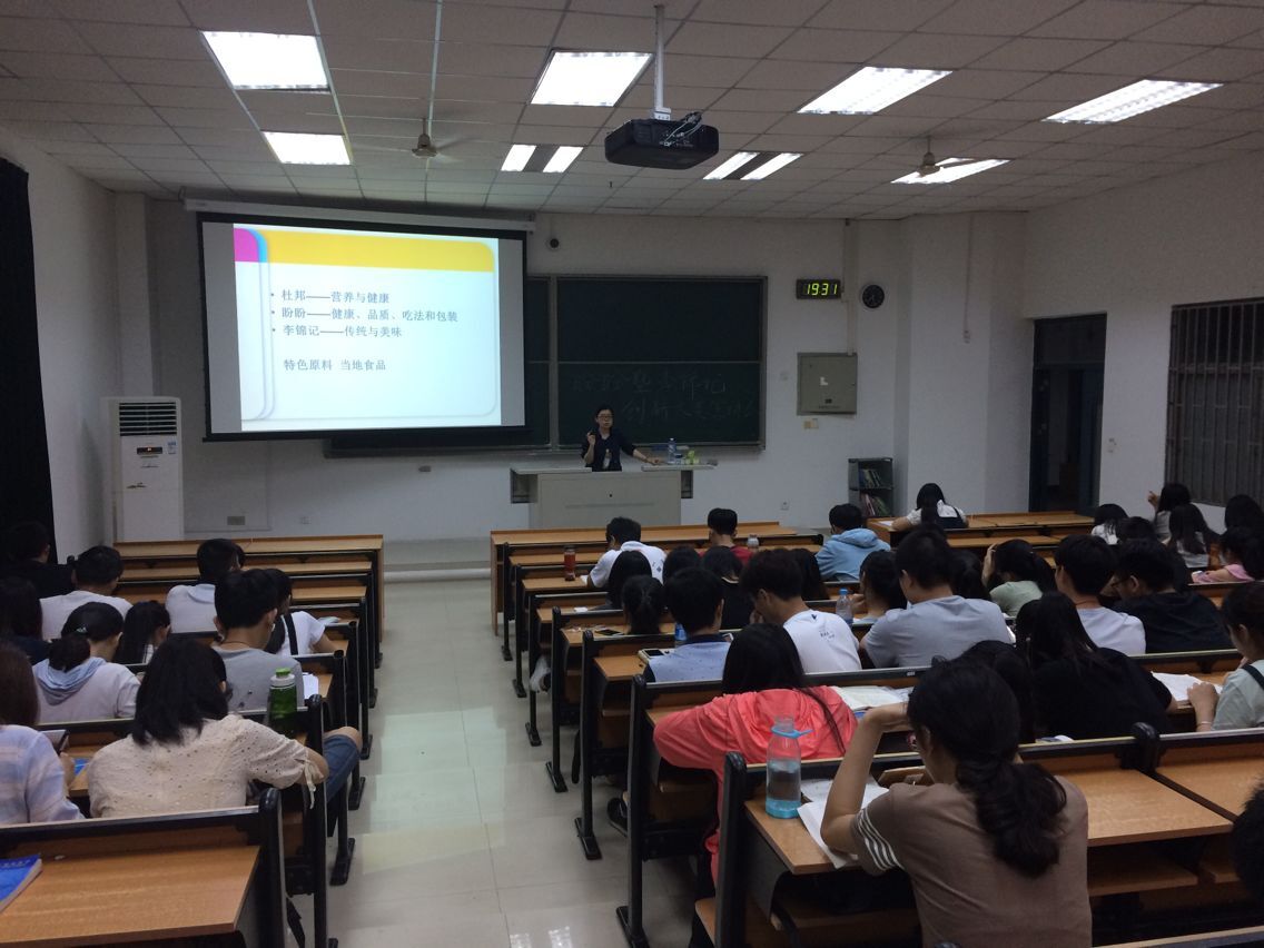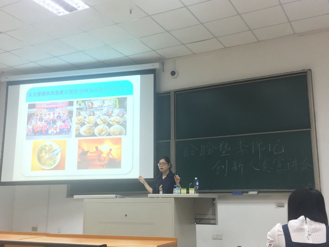 首先宣讲人张雯老师用内容丰富,条理清楚的ppt为大家介绍了往届91猫先生学生的得奖作品,比如燕丝,方便鱼糜面,笋心笋意等,充满了创意。同时老师也分析得奖作品的得奖原因,并鼓励大家从生活中寻找灵感。接着老师告诉同学们写策划书应该注意什么,包括后续操作的注意事项,并简单介绍了盼盼与李锦记两个创新大赛的比赛要求。宣讲会的最后,老师让同学们提出疑惑,并耐心进行解答。