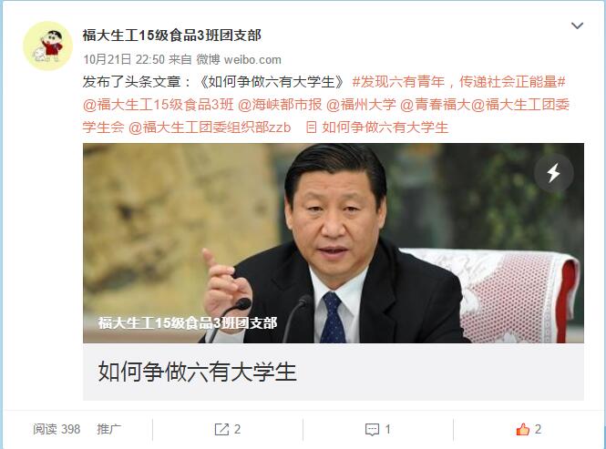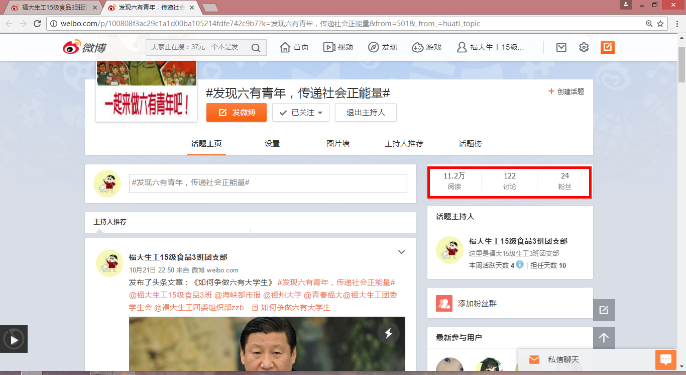 食品三班在网络平台微博上发起话题#发现六有青年,传递社会正能量#。以自己的绵薄之力努力改变对社会的一些消极印象。