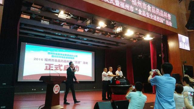 启动仪式上,王群书记致欢迎辞,并对此活动表示高度赞赏和热烈欢迎,希望通过政府、企业、高校,媒体等多方平台,共同努力、共同监督,提高食品安全领域各个环节。福州市市场监管局局长陈宗胜致辞,他表示,校园食品安全作为食品安全监管的重要环节,校园学生作为食品安全共治的生力军,均在食品安全监管占有重要一隅。随后他宣布2016福州市食品药品科普“五进”活动正式启动。