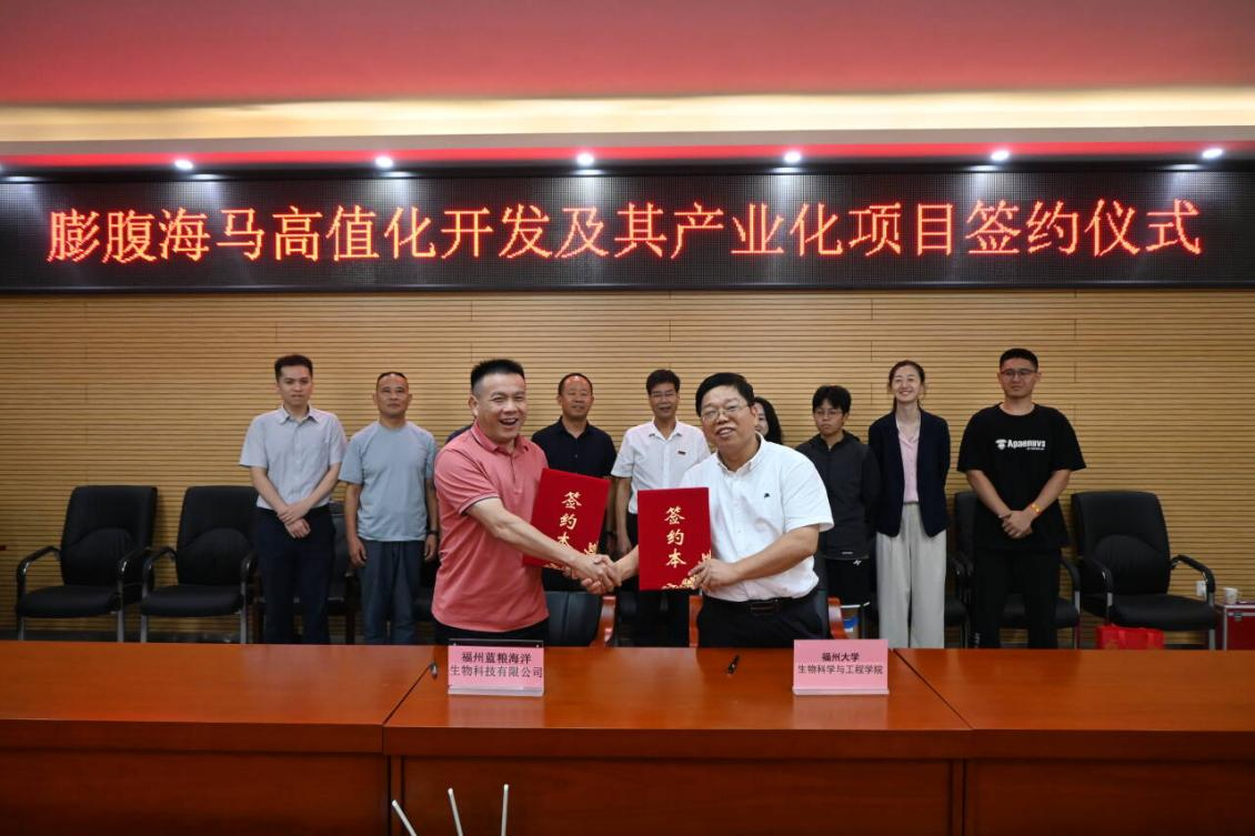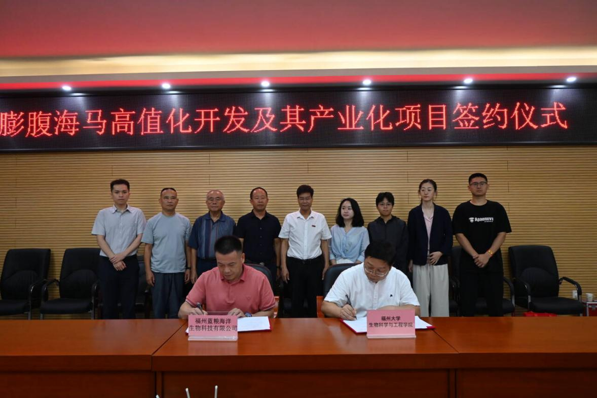 的科研平台,共同攻克技术难题,提升膨腹海马的产品附加值,以期开拓广阔的市场。随后,林向阳教授与蓝粮海洋生物科技有限公司总经理吴国斌先生作为双方代表,共同签署了校企合作协议。