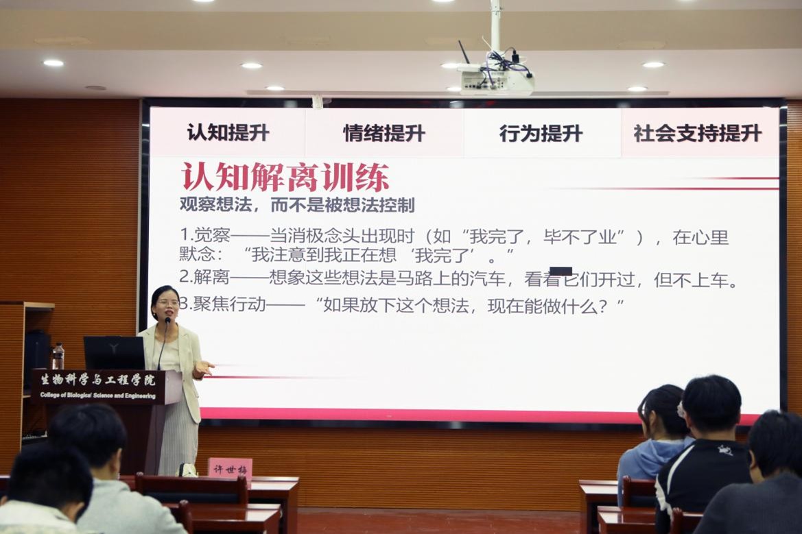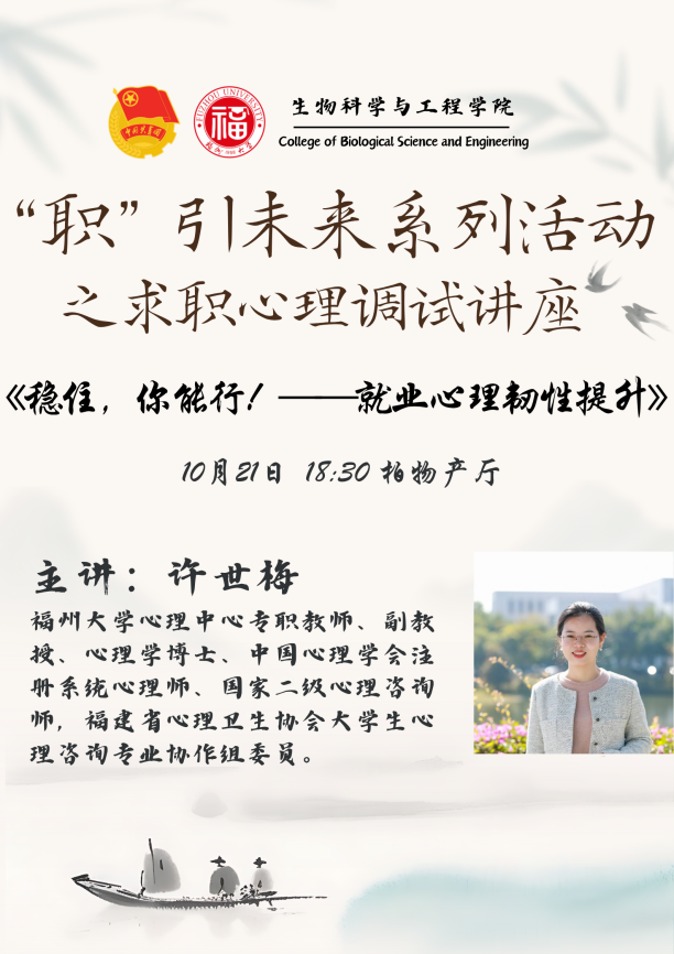进一步提升91猫先生毕业生就业指导服务质效,扎实推动2026届毕业生高质量充分就业,10月21日晚,一场以《稳住,你能行!——就业心理韧性提升》为主题的求职心理调适讲座,在生工北楼柏物产厅顺利举行。