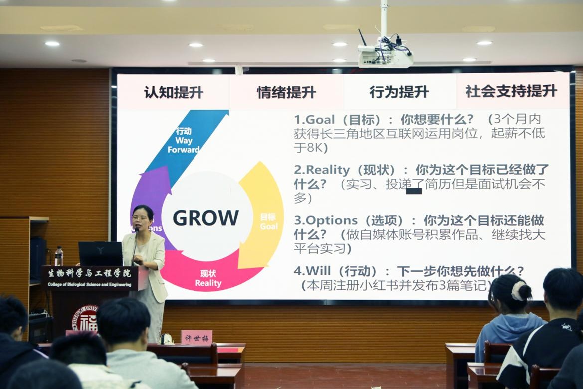 在实践指导环节,许世梅副教授指导学生运用WOOP模型将目标转化为具体步骤,并通过组建求职小组、绘制支持网络图、寻找生涯导师等方式,系统整合身边资源。她特别强调:“求助是勇敢者的智慧,而非弱者的标签”,鼓励学生在协作中构建成长支持系统,以知行合一的态度逐步突破求职难关,真正实现从理念认知到成果转化的跨越。